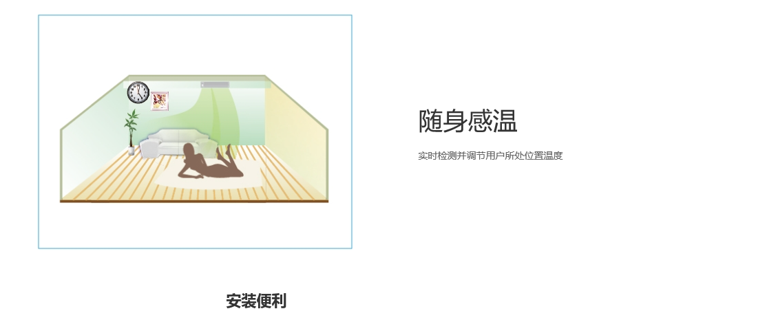 真芯實(shí)藝,力爭(zhēng)節(jié)能,室外機(jī)靜音運(yùn)行,安靜室內(nèi)環(huán)境,變頻技術(shù),不忽冷忽熱,除濕再熱,隨身感溫,安裝便利