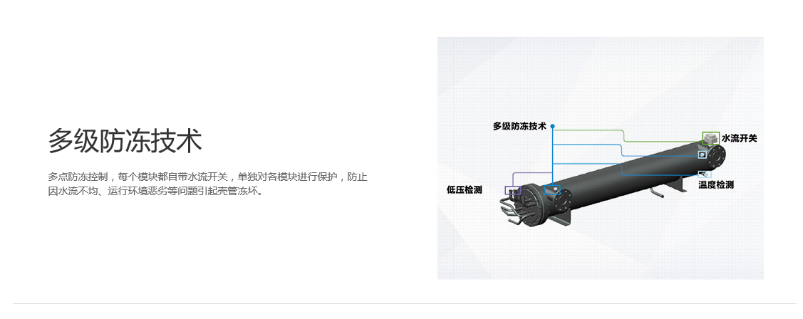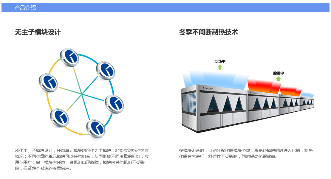 無主子模塊設(shè)計(jì)、不間斷制熱技術(shù)、模塊運(yùn)行均衡技術(shù)、多級防凍技術(shù)、寬運(yùn)行范圍